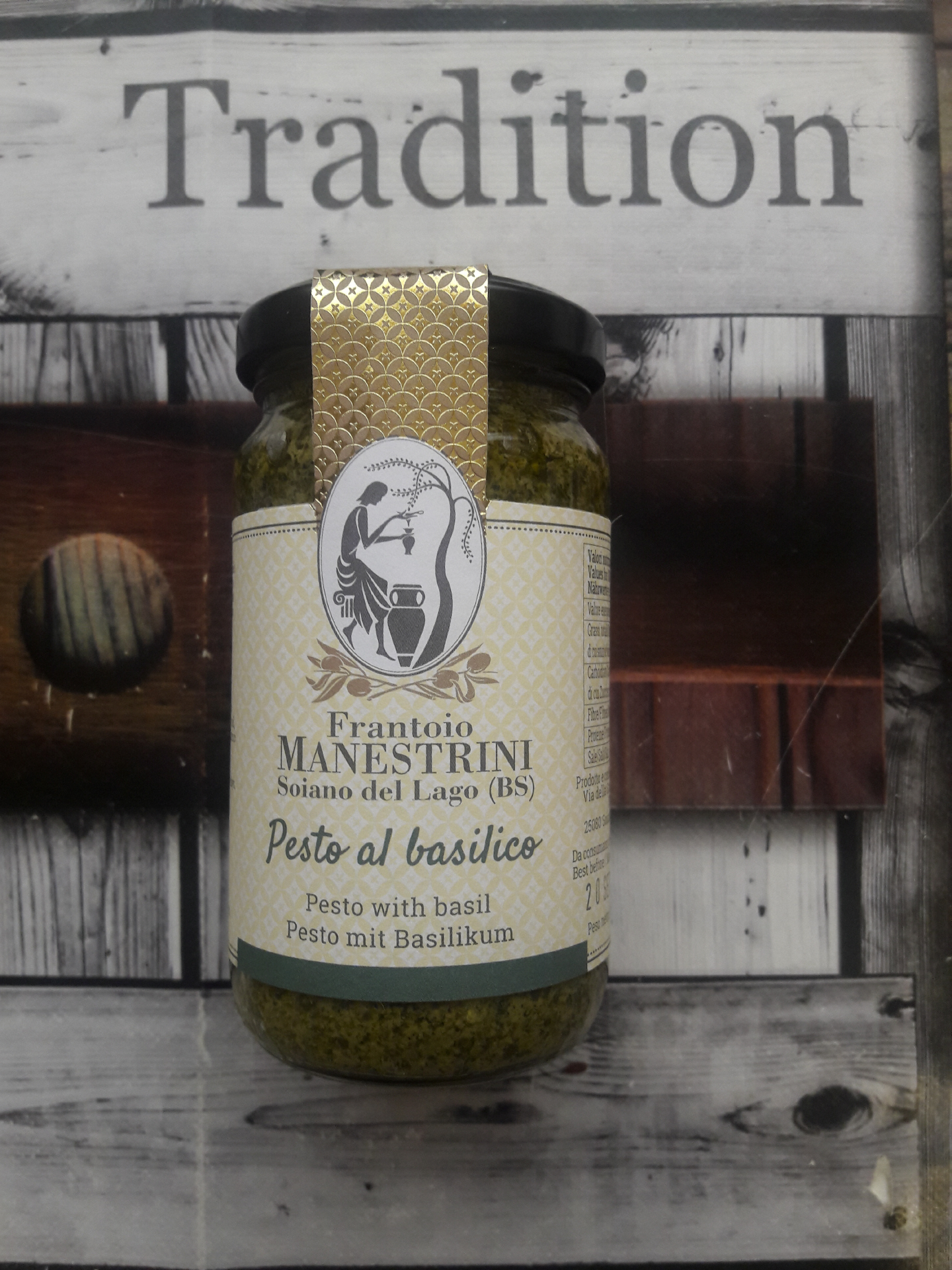 Zutaten: Basilikum 62 %, (Sonnenblumenöl, Meersalz, Säure: Ascorbinsäure), Olivenöl extra vergine, Mandeln, Pecorino (Ziegenmilch, Salz, Lab), Käse (Kuhmilch, Salz, Lab), Pinienkerne, Knoblauch, Petersilie, Säure: Milchsäure