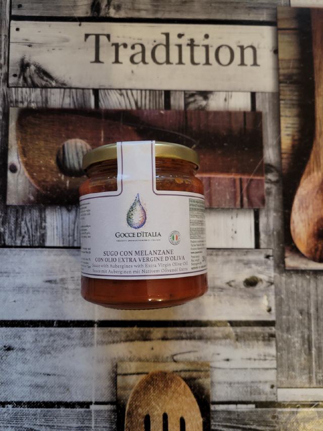 Zutaten: Tomatenpürre 75 %, Auberginen 18 %, Natives Olivenöl extra 5 %, Knoblauch, Basilikum, Petersilie, Minze, Salz, Zitronensäure