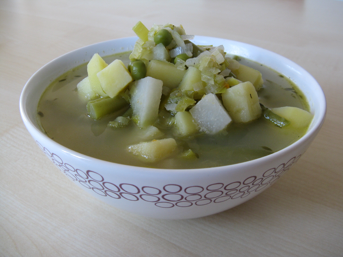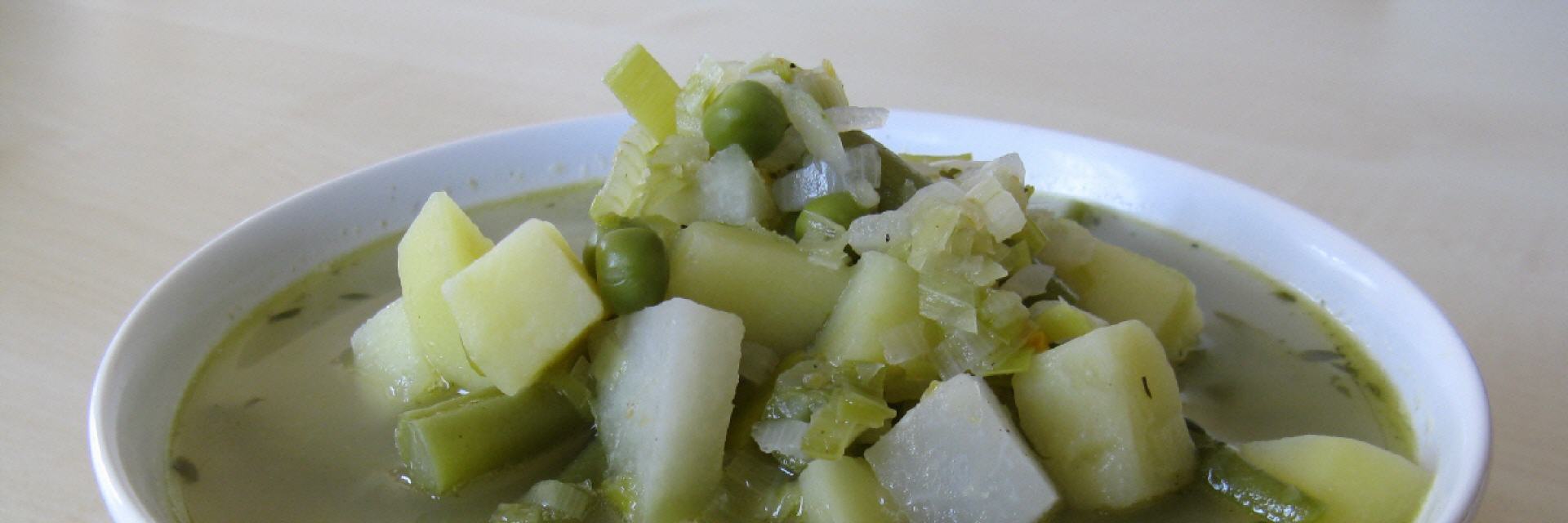 Zwiebel grob würfeln. Lauch putzen, das Weiße und Hellgrüne in ca. 1 cm breite Ringe schneiden. Kartoffeln und Kohlrabi schälen und grob würfeln. Fisolen putzen und halbieren.